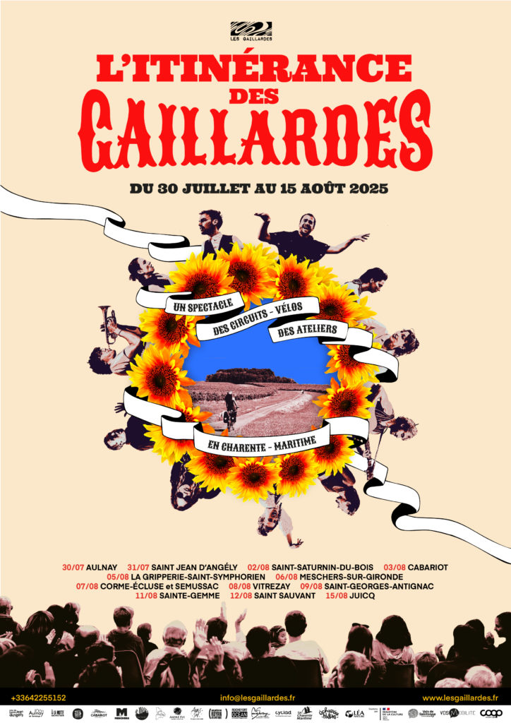 Les Gaillardes 2025, c’est : 17 jours, 12 représentations, 2 visites théâtralisées, 3 ateliers d’initiation au théâtre, 7 balades animées, plus de 500 kilomètres parcourus à vélos, une troupe de 12 artistes dont une scénographe et costumière, 1 cheffe-cuisinière, 1 régisseuse, 23 bénévoles tout au long de l’aventure et 79 cyclotouristes